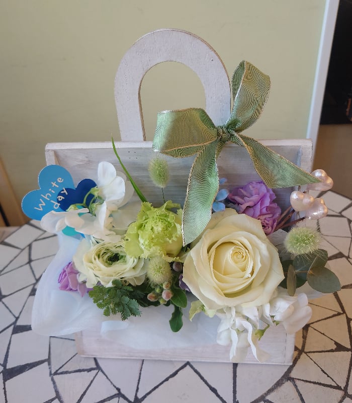 SOSHのホワイトデーフラワーアレンジメント 春のお花(生花)をハンドルつきのウッドボックスにアレンンジしました。