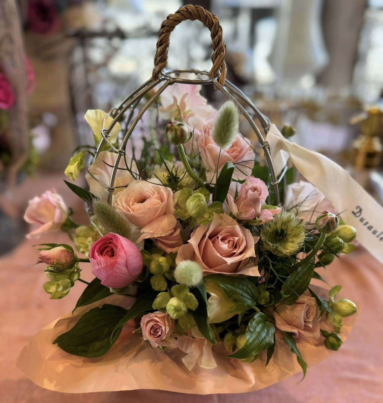 華やかな色合いのフレッシュフラワーを、バードゲージの中にアレンジしました。SOSHでとっても人気のアレンジメントです。